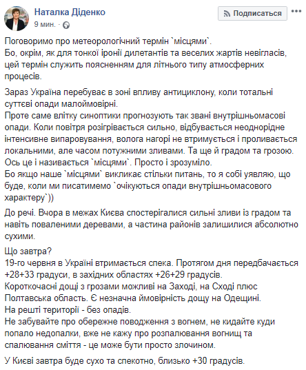 "Ну, и опять свежая, как горная река, надежда! По предварительным прогнозам, ослабление жары в Украине ожидается 24-25 июня. Постепенно: сначала запад затем север, центр и уже с 26-27 июня станет легче и на юге и востоке. А пока не отворачиваемся от небольших рекламных буклетов в переходах, ими можно хорошо махать на себя от жары", - написала Наталья Диденко.
