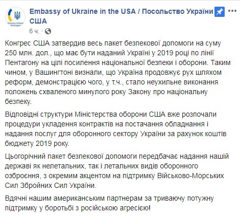 "Конгресс США утвердил весь пакет помощи по безопасности на сумму 250 млн долл., который должен быть предоставлен Украине в 2019 году по линии Пентагона на цели усиления национальной безопасности и обороны. Таким образом, в Вашингтоне признали, что Украина продолжает движение по пути реформ, демонстрацией чего, в т.ч. стало неуклонное выполнение положений принятого в прошлом году Закона о национальной безопасности", - говорится в сообщении.