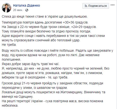 На западе с 22-го июня будет немного свежее, +24...+29 градусов, но здесь пройдут грозовые дожди, местами переходя в ливни, с шквалом или градом. "Локальные дожди могут распространиться на Житомирщину, Винницкую область и вечером в Одесскую область", - добавляет Диденко. На остальной территории Украины - сухая воздушная масса, высокая пожарная опасность.