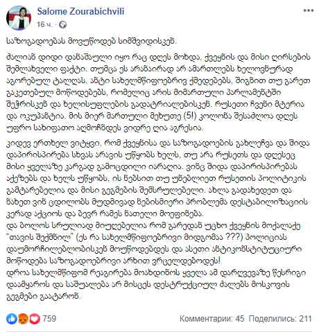 "Россия - наш враг и оккупант. Управляемая ею пятая колонна, возможно, сегодня может быть более опасной, чем открытая агрессия. Я хотела бы еще раз сказать, что раскол страны и общества и внутреннее противостояние никому не идут на руку, кроме России, и сегодня это её самое опытное оружие", - написала Саломе Зурабишвили.