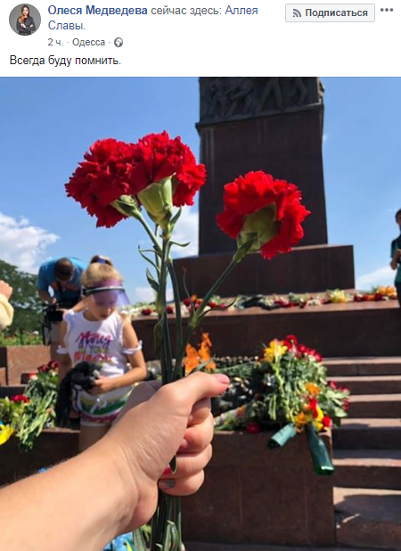 Специальный корреспондент "Страны", блогер Олеся Медведева выложила в памятную дату снимок с Аллеи Славы в Одессе с короткой подписью: "Всегда буду помнить".