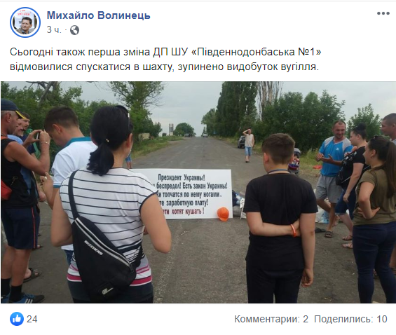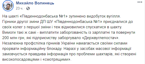 Также на шахте "Южнодонбасская №1" остановлена ​​добыча угля. "Горняки второй смены ГП ШУ "Южнодонбасская №1" присоединились к своим коллегам с первой смены и тоже отказались спускаться в шахту. Требования те же - выплатить задолженность по зарплате и вернуть 200 млн грн, которые предприятию задолжало "Госуглепостач". Независимый профсоюз горняков Украины пытается своими силами прорвать информационную блокаду. Сейчас в средствах массовой информации умалчивается правдивая информация о проблемах шахтеров, созданные чиновниками и "смотрящими".