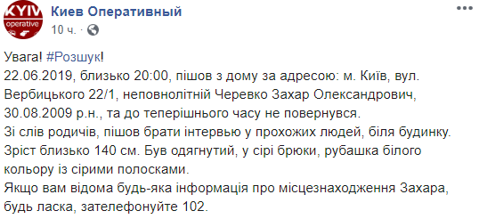 В полиции эту информацию пока не подтвердили. Его родные сообщили, что мальчик ушел брать интервью у прохожих возле дома. Так ранее писали в Телеграм-канале "Киев.Оперативный". "Его рост – около 140 см. Был одет в серые брюки и белую с серыми полосками рубашку", – уточнили в соцсети.