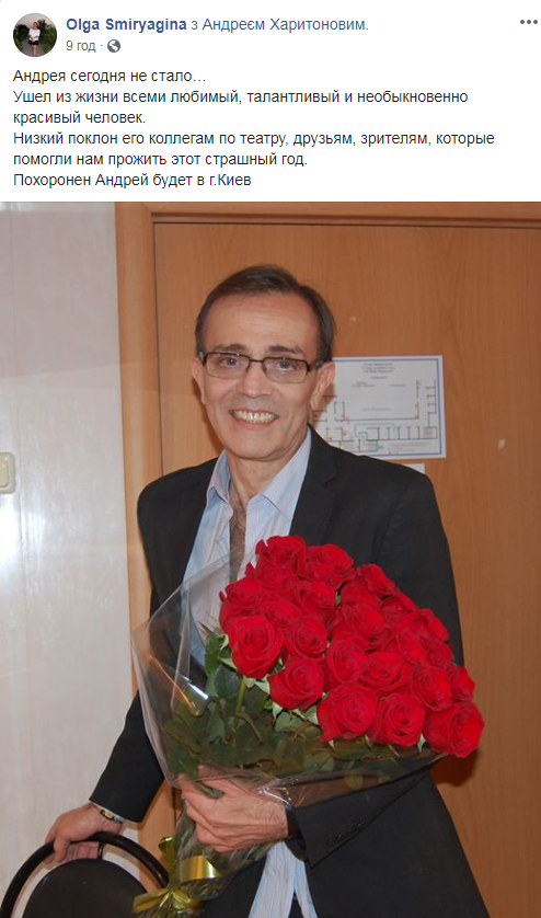 Смерть Андрея Харитонова подтвердила также его супруга Ольга Смирягина. "Ушел из жизни всеми любимый, талантливый и необыкновенно красивый человек. Низкий поклон его коллегам по театру, друзьям, зрителям, которые помогли нам прожить этот страшный год", - написала она в Facebook. Как сообщила Смирягина, актера похоронят на его родине в Киеве. О дате похорон пока не сообщается.