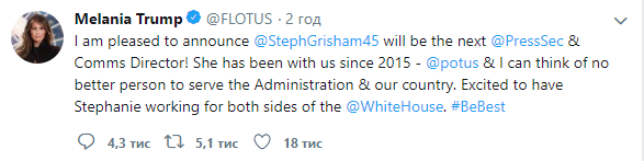 "Я рада объявить, что Стефани Гришэм будет следующим представителем Белого дома и директором по связям с общественностью", - написала она в твиттере.