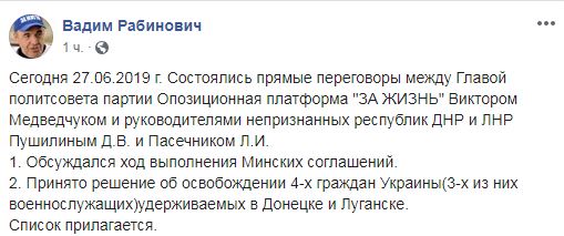 "Сегодня 27.06.2019 г. Состоялись прямые переговоры между Главой политсовета партии Опозиционная платформа "За жизнь" Виктором Медведчуком и руководителями непризнанных республик ДНР и ЛНР Пушилиным Д.В. и Пасечником Л.И. 1. Обсуждался ход выполнения Минских соглашений. 2. Принято решение об освобождении 4-х граждан Украины (3-х из них военнослужащих) удерживаемых в Донецке и Луганске", - написал Рабинович и приложил список.