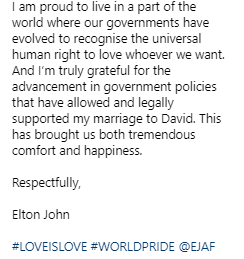 Музыкант также заявил, что гордится жизнью, где государства признают право человека любить того, кого он хочет. Он также выразил свою благодарность за жизнь в счастливом браке со своим супругом.