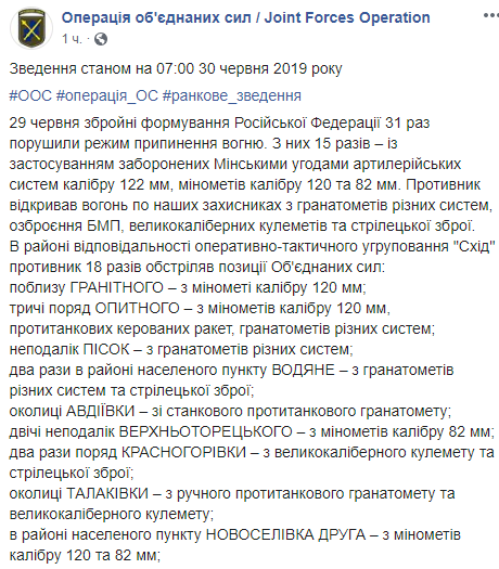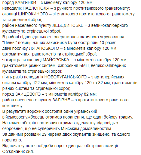 "29 июня вооруженные формирования Российской Федерации 31 раз нарушили режим прекращения огня. Из них 15 раз - с применением запрещенных Минскими соглашениями артиллерийских систем калибра 122 мм, минометов калибра 120 и 82 мм... В результате вражеских обстрелов один украинский военнослужащий получил ранения, еще один боевую травму", - говорится в сообщении.