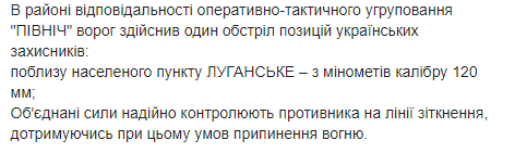 В районе ответственности оперативно-тактической группировки "Север" позиции украинских защитников были обстреляны 13 раз. В частности, дважды возле Луганского - из минометов калибра 120 мм, автоматических гранатометов и стрелкового оружия, четыре раза окраину Майорска - из минометов калибра 120 мм, гранатометов различных систем, вооружения БМП, крупнокалиберных пулеметов и стрелкового оружия, пять раз неподалеку Новолуганского - из артиллерийских систем калибра 122 мм, минометов калибра 120 и 82 мм, гранатометов различных систем и стрелкового оружия, рядом с Зайцево - из минометов калибра 82 мм, район н.п. Железное – из противотанкового ракетного комплекса.