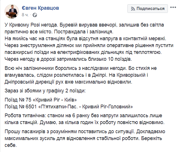 Как рассказал Кравцов, ураган, пронесшийся вечером 2 июля, оставил без света практически весь Кривой Рог. Из-за него пострадала и железная дорога. Некоторое время на станциях отсутствовало напряжение в контактной сети, в пути задержалось около 10 поездов. Поэтому руководство "Укрзализныци" приняло решение пустить пассажирские поезда на тепловой тяге.