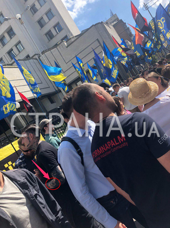 Сегодня, 4 июля, в Киеве на пикете сторонников экс-президента Петра Порошенко и радикалов у здания Конституционного суда был замечен участник митинга с татуировкой свастики на руке.