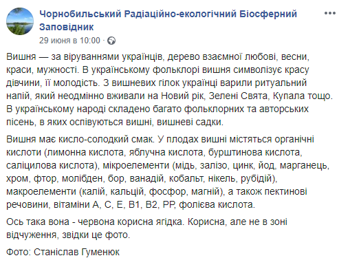"Вишня имеет кисло-сладкий вкус. В плодах вишни содержатся органические кислоты (лимонная кислота, яблочная кислота, янтарная кислота, салициловая кислота), микроэлементы (медь, железо, цинк, йод, марганец, хром, фтор, молибден, бор, ванадий, кобальт, никель, рубидий), макроэлементы (калий, кальций, фосфор, магний), а также пектиновые вещества, витамины а, С, Е, В1, В2, РР, фолиевая кислота. Вот такая она - красная полезна ягодка. Полезная, но не в зоне отчуждения, откуда это фото", - предостерегают на странице Чернобыльского радиационно-экологического биосферного заповедника. Там же демонстрируется, какие красивые плоды уродились на вишневых деревьях в зоне отчуждения.