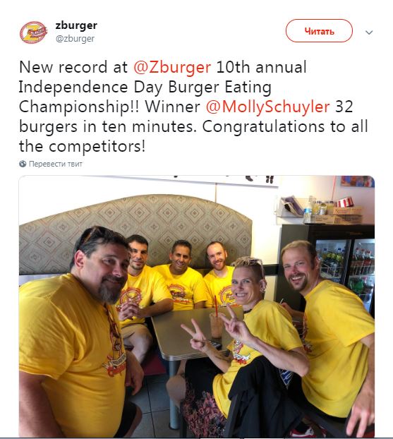 Жительница Калифорнии Молли Скалер в пятый раз подряд одержала победу в ежегодном конкурсе по скоростному поеданию бургеров, проводимому в Вашингтоне сетью закусочных Z-Burger. Об этом сообщили в своем Twitter организаторы состязаний.