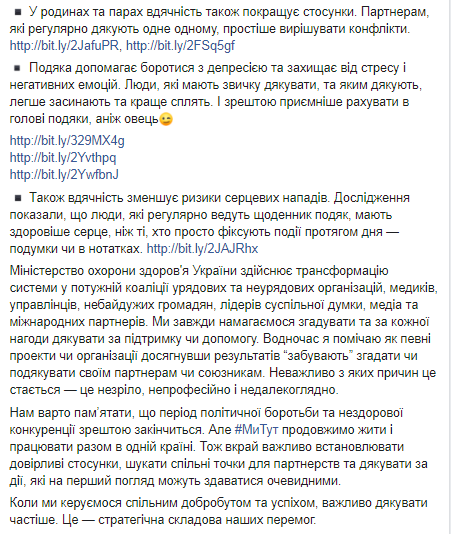Украинцам стоит не забывать о привычке благодарить, особенно в период активной политической борьбы, многочисленных негативных новостей и растущей агрессии в социальных сетях. Об этом сообщила и.о. главы Минздрава Ульяна Супрун на своей странице в Facebook.