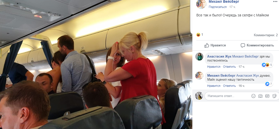 По дороге в Киев в самолете, в котором бизнес-классом летел Тайсон, к нему выстроилась очередь из желающих сделать фото на память. Пользователи соцсетей делятся снимками.