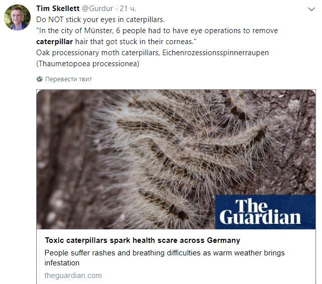В соцсетях пользователи выражают свое беспокойство возникшей ситуацией. Так, в немецком Мюнстере 6 человек вынуждены были сделать операцию на глазах, чтобы удалить гусеничные волосы из роговицы.