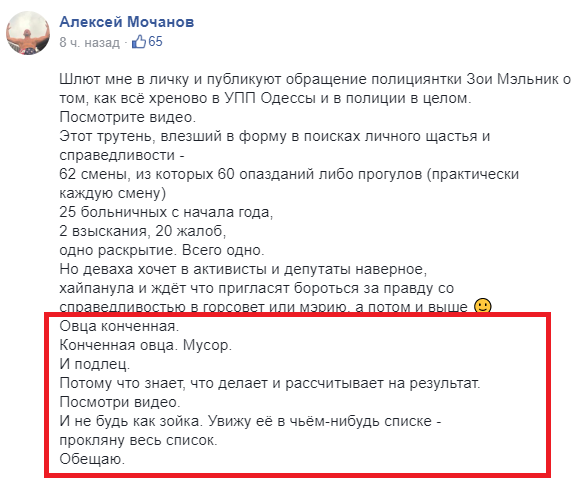 "Началась травля Зои Мельник, в которой участвует не только начальство полиции и МВД (включая Антона Геращенко, который лайкает посты Жукова), но и приближенные к этим структурам журналисты и общественные деятели, наподобие Алексея Мочанова. Любитель ездить в состоянии алкогольного опьянения Алексей Мочанов, друг начальника ДПП Жукова, на своей странице написал, что Зоя Мельник конченная овца, мусор и так далее. Честно говоря, смешно читать такое от человека, который любит покататься бухим и всю жизнь находится у кого-то на подсосе - сначала у начальства ГАИ, теперь у начальства ДПП", - написал он.