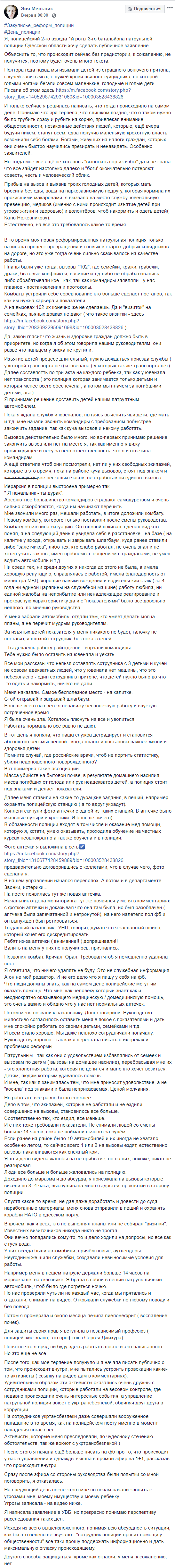 "В то время моя новая реформированная патрульная полиция только начинала процесс превращения из новых в старых добрых колядныков на дороге, но это уже тогда очень сильно сказывалось на качестве работы. Планы были уже тогда, вызовы "102", где семейки, кражи, грабежи, драки, бытовые конфликты, насилие и т.д либо не обрабатывались, либо обрабатывали кое-как, так как командиры заявляли - у нас главное - постановления и протоколы", - пишет Мельник.