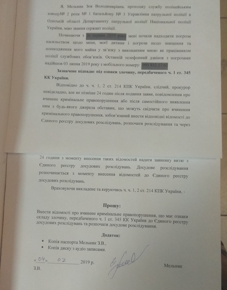 Мельник начала больше писать о полиции в Facebook, после чего ей приходили угрозы. Она написала заявление в Управление внутренней безопасности Нацполиции, но не рассчитывает, что ее дело расследуют.