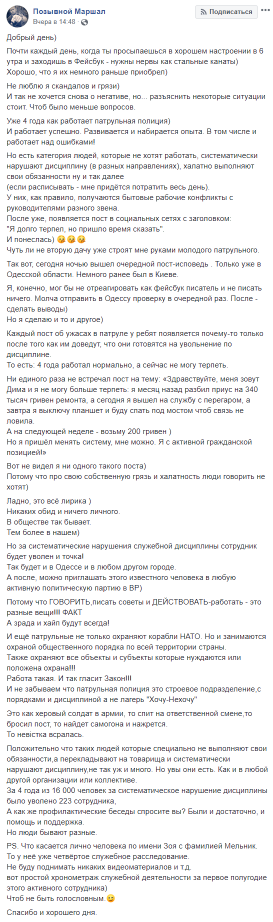 Глава Патрульной полиции Украины Евгений Жуков, который пишет в Facebook как Позывной Маршал, решил сохранить честь мундира и опубликовал свою версию развития ситуации.