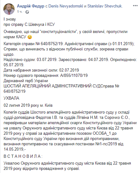 Из сообщения становится понятно, что коллегия судей отказала в открытии апелляционного производства по жалобе Конституционного суда Украины на постановление Окружного административного суда города Киева от 22 мая 2019 года.