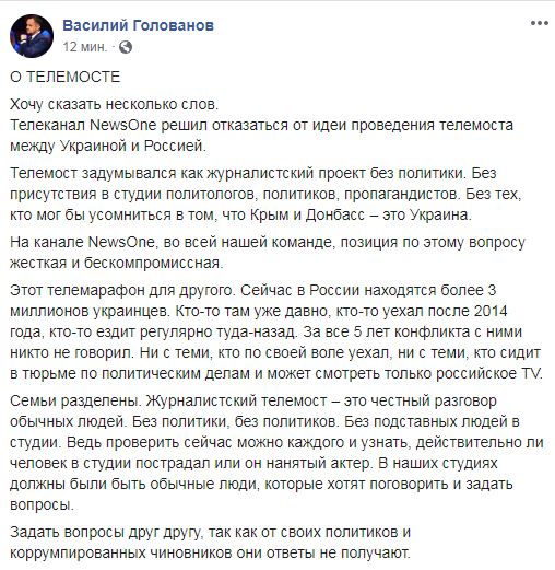 Голованов подтвердил, что телеканал NewsOne решил отказаться от идеи проведения телемоста между Украиной и Россией. "Телемост задумывался как журналистский проект без политики. Без присутствия в студии политологов, политиков, пропагандистов. Без тех, кто мог бы усомниться в том, что Крым и Донбасс – это Украина. На канале NewsOne, во всей нашей команде, позиция по этому вопросу жесткая и бескомпромиссна", - написал он.