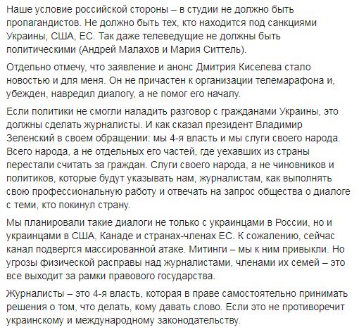 Генпродюсер подчеркивает, что канал планировал такие диалоги не только с украинцами в России, но и украинцами в США, Канаде и странах-членах ЕС. "К сожалению, сейчас канал подвергся массированной атаке. Митинги – мы к ним привыкли. Но угрозы физической расправы над журналистами, членами их семей – это все выходит за рамки правового государства", - считает генпродюсер.