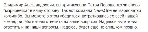 "Владимир Александрович, вы критиковали Петра Порошенко за слово "марионетка" в вашу сторону. Так вот команда NewsOne не марионетки кого-либо. Вы можете в этом убедиться, встретившись со всей нашей командой. Мы готовы ответить на ваши вопросы. Надеюсь вы готовы ответить и на наши вопросы. Надеюсь будет ещё не слишком поздно", - резюмировал Голованов.