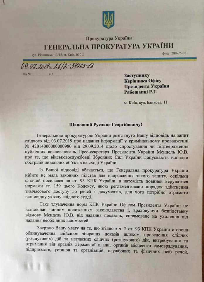 ГПУ направила повторный запрос в Офис президента в связи с заявлениями пресс-секретаря президента Мендель о военных ВСУ