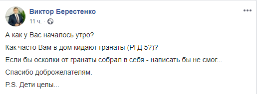 Нужно отметить, что пострадавший - председатель общественного совета при ГФС в Одесской области Виктор Берестенко. "Спасибо доброжелателям. PS. Дети целы", - написал он на своей странице в Facebook.