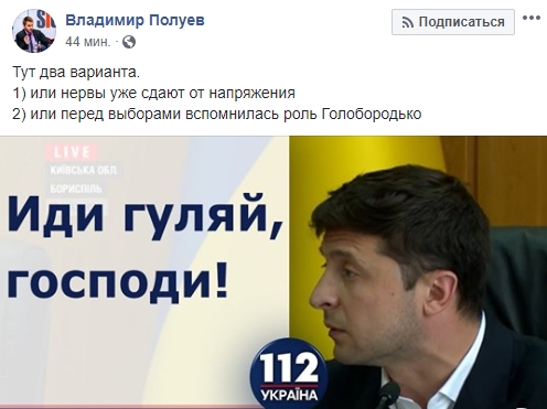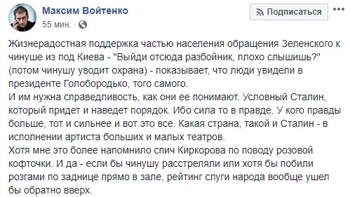 Журналист Максим Войтенко: "Жизнерадостная поддержка частью населения обращения Зеленского к чинуше из под Киева - "Выйди отсюда разбойник, плохо слышишь?" (потом чинушу уводит охрана) - показывает, что люди увидели в президенте Голобородько, того самого.