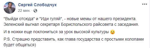 Политтехнолог Сергей Слободчук: "Выйди отсюда" и "Иди гуляй", - новые мемы от нашего президента. Зеленский выгнал секретаря Бориспольского горсовета с заседания.