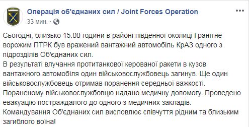 10 июля в районе южной окраины Гранитного на Донбассе враждебным ПТРК был поражен грузовой автомобиль КрАЗ одного из подразделений Объединенных сил. Об этом сообщает пресс-служба штаба ООС в Facebook.