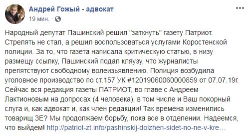 "Народный депутат Пашинский решил "заткнуть" газету Патриот. Стрелять не стал, а решил воспользоваться услугами Коростенской полиции. За то, что газета написала критическую статью", - написал Гожый. По его словам, Пашинский "подал кляузу, что журналисты препятствуют свободному волеизьявлению".