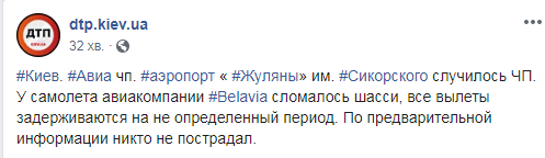 Сегодня, ранним утром, 13 июля, в аэропорту "Киев" (бывший "Жуляну - Прим.Ред.) произошло ЧП. У пассажирского лайнера белорусской авиакомпании Belavia сломалось шасси, все вылеты задерживаются на не определенный период. По предварительной информации никто не пострадал.