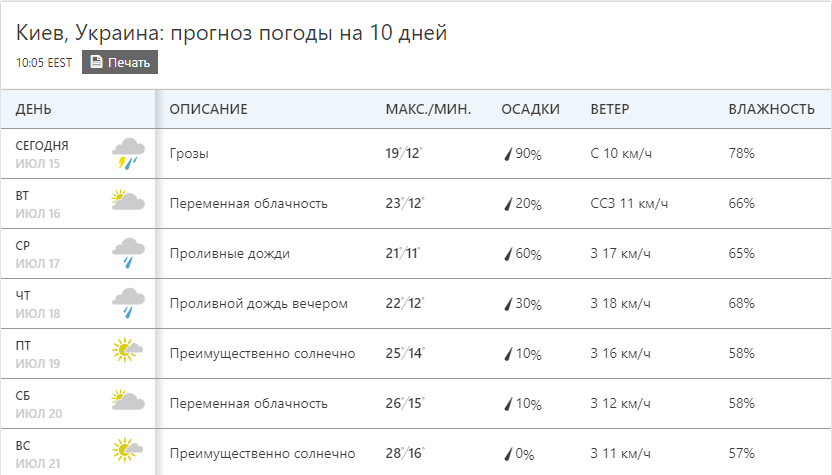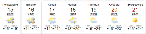Сайт Weather.com сообщает о грозе в понедельник. Во вторник - без осадков. В среду и четверг - проливные дожди. Дневная температура: +19...+28. Теплее всего - в воскресенье, 21 июля.