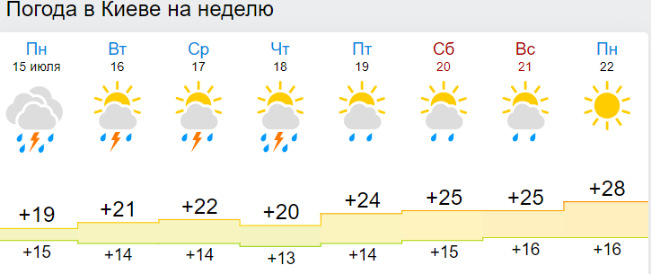 На этой неделе в Киеве, с 15 по 21 июля, ожидаются дожди с грозами. Температура воздуха +20...+29. Причем теплеть начнет к выходным, которые, кстати, намечаются без осадков. Воскресенье, 21 июля, будет самым теплым и солнечным днем недели.