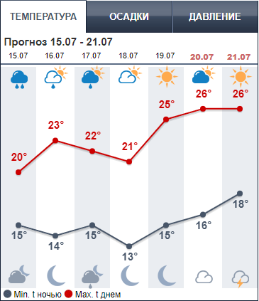 Ресурс Мeteoprog.ua обещает меньше осадков, чем другие ресурсы: с понедельника по среду. При этом 16 и 17 июля это будет небольшой дождь. В воскресенье и субботу, 20 и 21 июля, без осадков. Днем столбики термометров поднимутся до +20...+25. На выходных до +26. Ночью +13...+18.