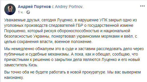 "Сегодня Луценко… закрыл одно из уголовных производств следователей ГБР о государственной измене Порошенко, который рискуя обороноспособностью и национальной безопасностью Украины, пожертвовал украинскими моряками и ввел, с целью сохранения власти, военное положение. Мы немедленно обжалуем это в суде и заставим расследовать дело через публичные и судебные механизмы", - написал Портнов.