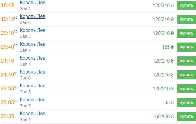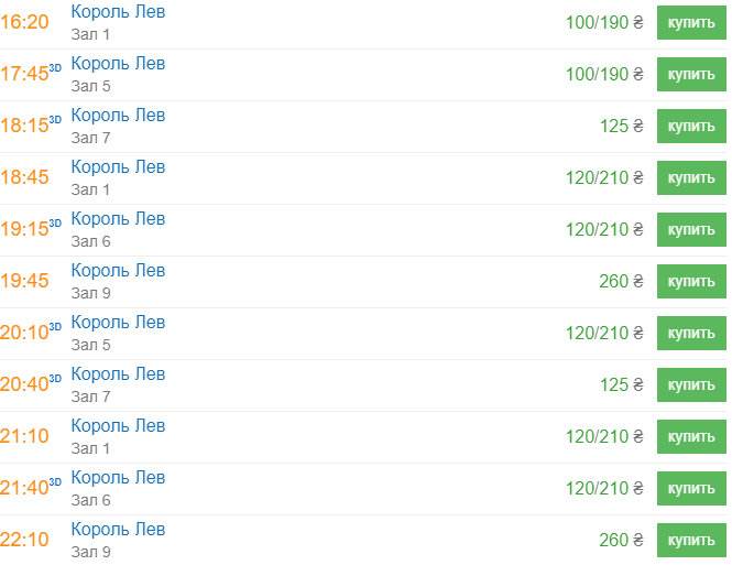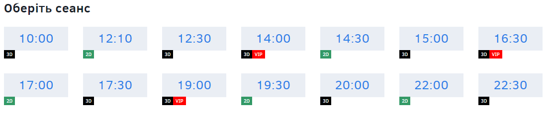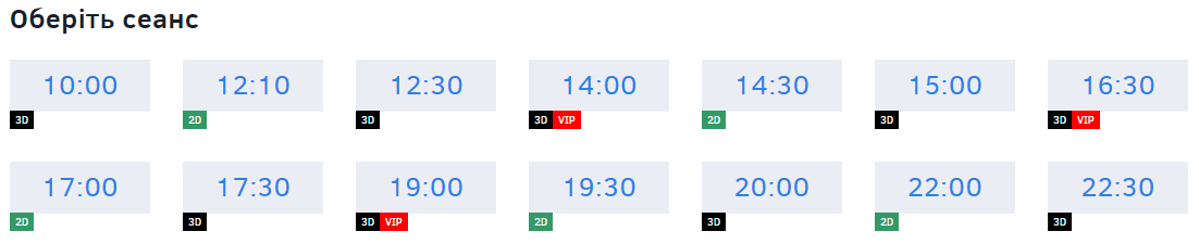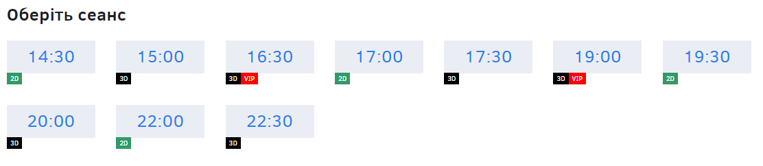 Начало сеансов - с 10:00, окончание - 22:30. Билеты Standard стартуют от 70-100 грн., VIP - 500 грн, сеансы с 19:30 - по 180 грн за билет.