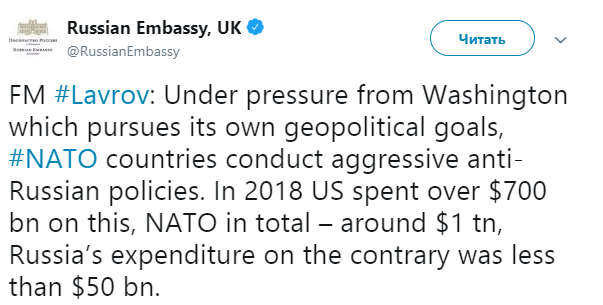 Посольство России в Лондоне опубликовало в Twitter карту, на котором полуостров Крым обозначен как территория Украины. В твите приводится цитата министра иностранных дел РФ Сергея Лаврова: "Под давлением Вашингтона, который преследует свои геополитические цели, страны НАТО проводят агрессивную антироссийскую политику. В 2018 году США потратили на это более 700 миллиардов долларов, в общей сложности НАТО - около 1 триллиона долларов, а расходы России, напротив, составили менее 50 миллиардов долларов".