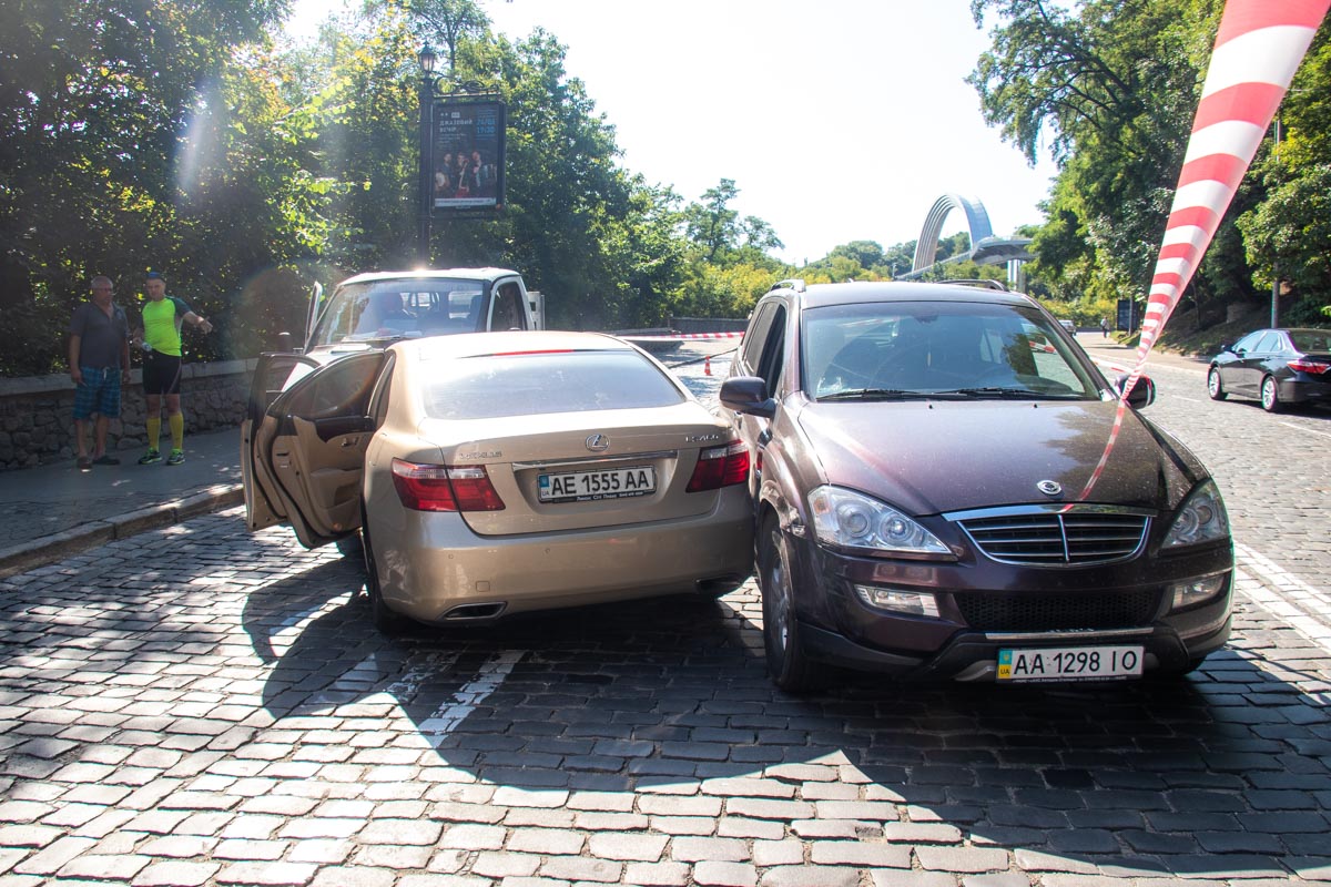 Инцидент произошел около 09:00 на Владимирском спуске. Здесь лоб в лоб столкнулись ГАЗель и Lexus, который вылетел на встречную полосу, ударив перед этим Ssang Yong. По словам водителя ГАЗели, он спускался по Владимирскому спуску в сторону Почтовой площади и увидел, как Lexus вылетел на встречную полосу, врезался в Ssang Yong, а после и в его грузовик.