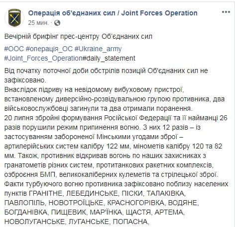 Договоренность о прекращении огня в Донецкой и Луганской областях с 00.01 21 июля была достигнута 17 июля на заседании в Минске Трехсторонней контактной группы. В утренней сводке штаба ООС указывалось, что с начала суток обстрелы не зафиксированы. Позднее пришло сообщении о подрыве в районе города Счастье (Луганской области) на взрывном устройстве, установленном диверсантами, четырех украинских бойцов. Двое из них погибли.