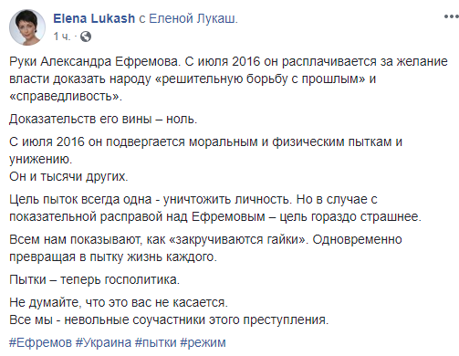 Экс-министр юстиции и адвокат Елена Лукаш тогда написала, что Александр Ефремов расплачивается за желание власти [Порошенко] доказать народу "решительную борьбу с прошлым".