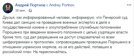 "Друзья, как информированный человек, информирую, что Печерский суд Киева дал санкцию на проведение военных экспертиз в деле о государственной измене и злоупотреблении служебным положением Порошенко при введении военного положения с целью узурпации власти. Кроме того, суд дал разрешение на доступ следователей ко всем шифрограммам и протоколам, сопровождавшим провокацию Порошенко в отношении украинских моряков, из-за его действий, попавших в российский плен. Не переключайтесь", - говорится в сообщении.