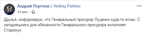 "Друзья, информирую, что Генеральный прокурор Луценко куда-то исчез. С сегодняшнего дня обязанности Генерального прокурора исполняет Сторожук", - написал Портнов.