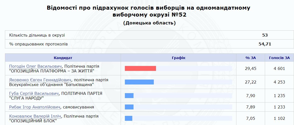 Отметим, что по состоянию на 20:00 по округу обработано всего 54,71% протоколов. По результатам голосования в округе лидирует представитель "Оппозиционной платформы -За жизнь" Олег Погодин с 29,45%, а вот Евгений Яковенко от "Батькивщины" отстает всего на 2,23%.