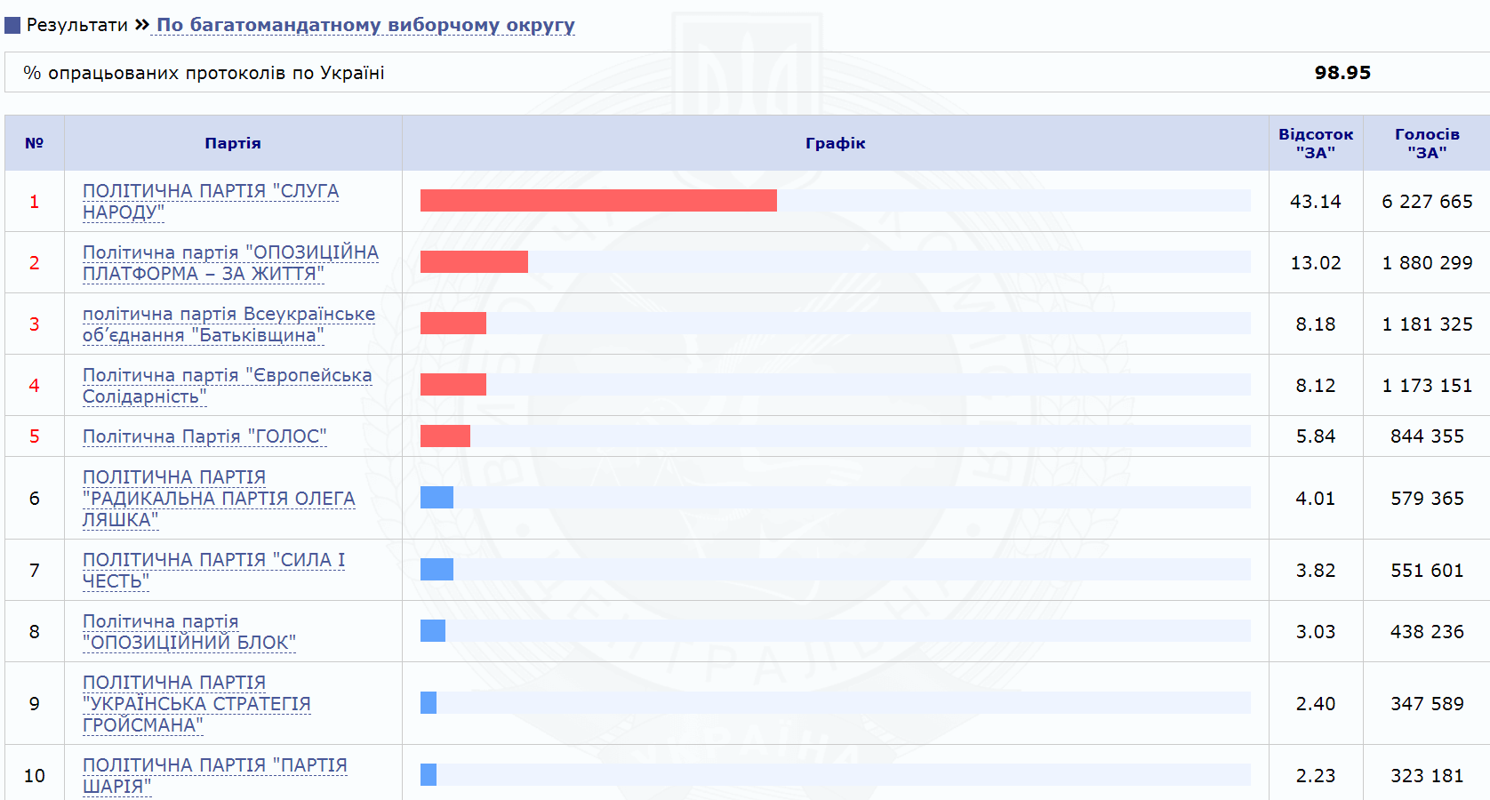 По состоянию на 06:50, 24 июля, Центральная избирательная комиссия обработала 98,95% протоколов внеочередных парламентских выборов. В лидерах "Слуга народа" и "Оппозиционная платформа", на третьем месте "Батькивщина", незначительно опережающая "Европейскую солидарность".