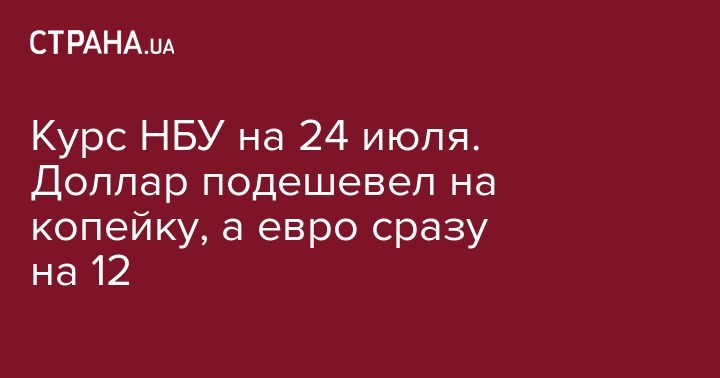 Национальный банк Украины в среду, 24 июля, установил официальный курс основных валют по отношению к гривне. По сравнению с предыдущим банковским днем, доллар подешевел на одну копейку. Об этом свидетельствуют данные на официальном сайте НБУ.