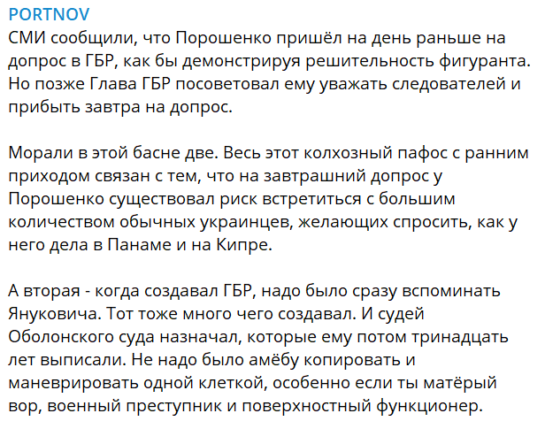 "Морали в этой басне две. Весь этот колхозный пафос с ранним приходом связан с тем, что на завтрашний допрос у Порошенко существовал риск встретиться с большим количеством обычных украинцев, желающих спросить, как у него дела в Панаме и на Кипре.